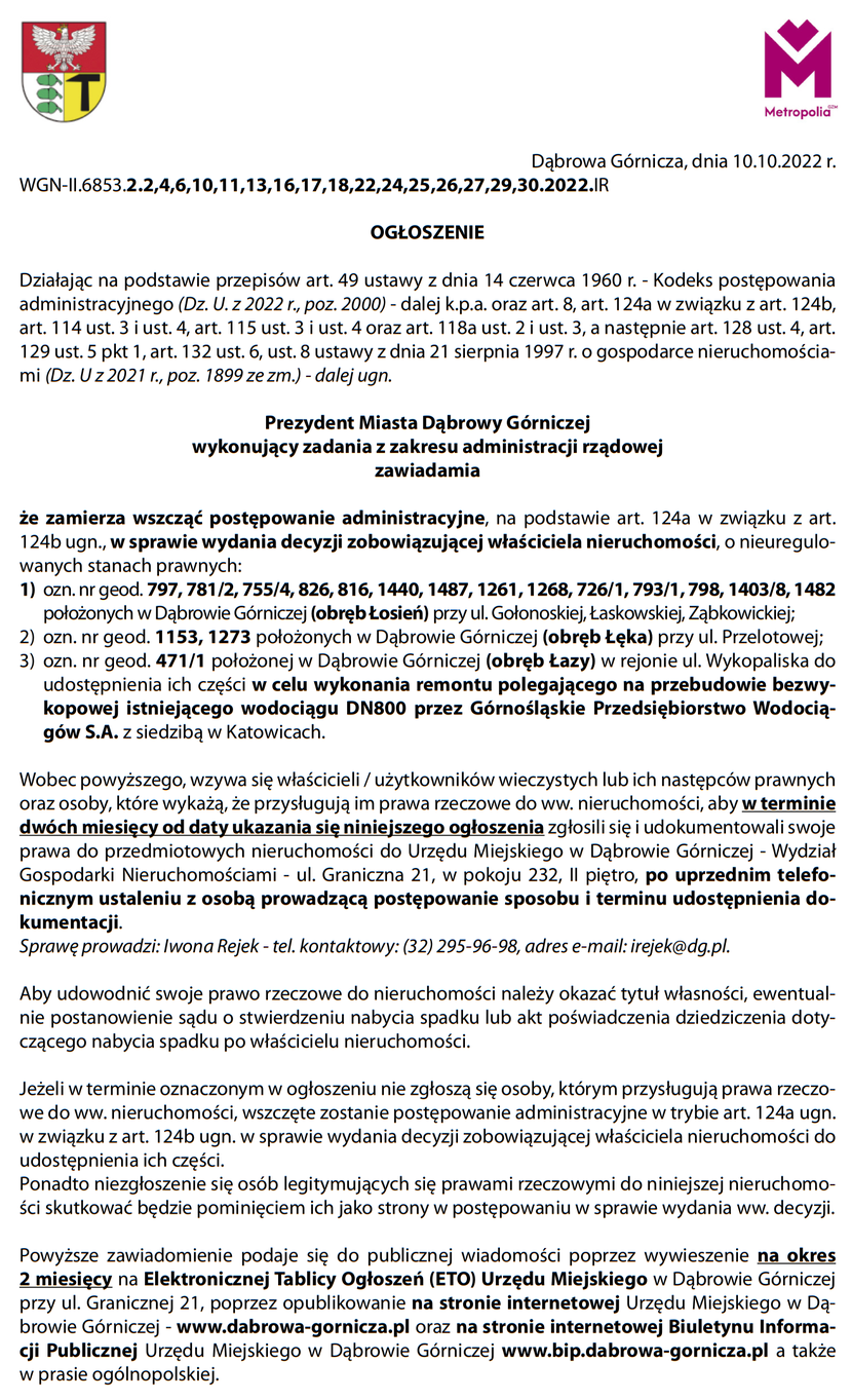 Prezydent Miasta Dąbrowy Górniczej wykonujący zadania z zakresu administracji rządowej zawiadamia Komunikat partneraopublikowano: 2022-10-21 14:52PosłuchajZostań subskrybentemi słuchaj tego oraz wielu innych artykułów w pb.pl