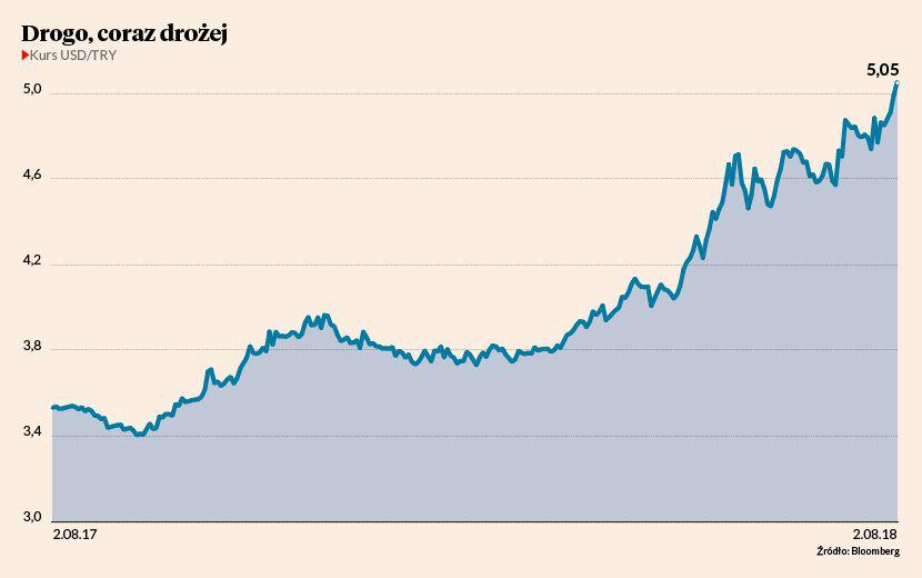 Od wiosny można mówić, że w Turcji trwa kryzys walutowy. Od początku roku lira straciła 25 proc. względem dolara amerykańskiego. W czwartek za dolara płacono już rekordowe 5,07 lir. Euro kosztowało prawie 5,90 lir. Przypomnijmy, że jeszcze w marcu Turcy płacili za euro 4,65 TRY.