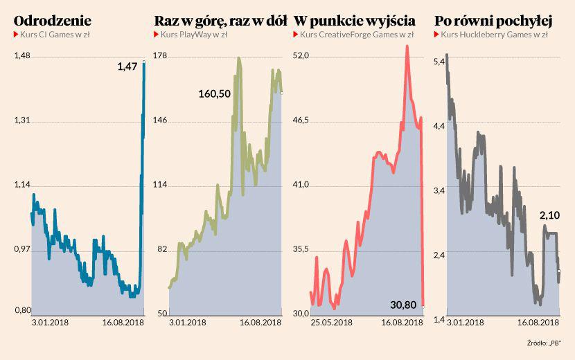 Hossa na akcjach CD Projektu zatrzymała się poniżej ceny 220 zł, więc część uwagi i kapitału przesunęła się na spółkę, która kiedyś była na giełdzie numerem 2 w branży, ale po klapie trzeciej odsłony sztandarowego produktu trafiła do kategorii walorów spekulacyjnych. To, co było kiedyś wadą, teraz jest atutem, bo informacja o złożeniu 2 sierpnia wniosku o zarejestrowanie znaku towarowego „Sniper Ghost Warrior Contracts” obudziła notowania, które w kilka sesji urosły o połowę. W czwartek 16 sierpnia skoczyły o ponad 10 proc. po tym, jak zarząd oficjalnie potwierdził zamiar publikacji kolejnej gry ze snajperskiej serii. Produkcja ma się pojawić na rynku w 2019 r. (warto