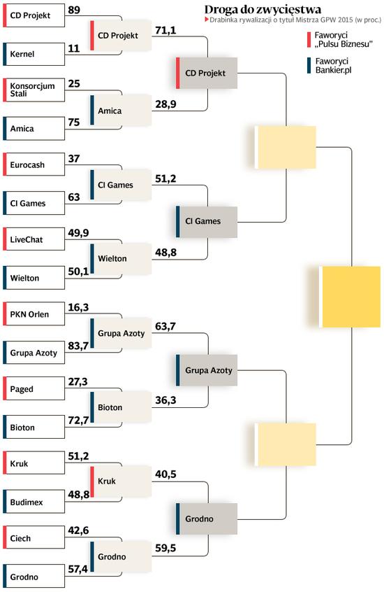 W drodze na ten szczebel pierwsza ze spółek gładko odprawiała rywali. Najpierw Kernela w stosunku 89 do 11, później Amikę 71 do 29. CI Games swoje pojedynki wygrywała mniej efektownie. O ile jeszcze przewaga głosów nad Eurocashem była wyraźna (63-37), o tyle rywalizacja z Wieltonem toczyła się łeb w łeb do ostatnich minut i o awansie producenta gier zdecydowała ostatecznie różnica 2,4 proc. głosów. Tak jak różna była droga do półfinału, tak różna była też sytuacja rynkowa obu firm w 2015 r.