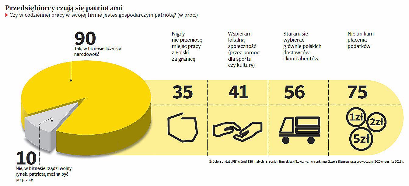 Aż 90 proc. przedsiębiorców deklaruje, że w działalności biznesowej są patriotami — wynika z badania „PB” wśród szefów małych i średnich firm sklasyfikowanych w rankingu Gazele Biznesu. Tylko dla 10 proc. przedsiębiorców biało-czerwone barwy nie mają w pracy znaczenia.