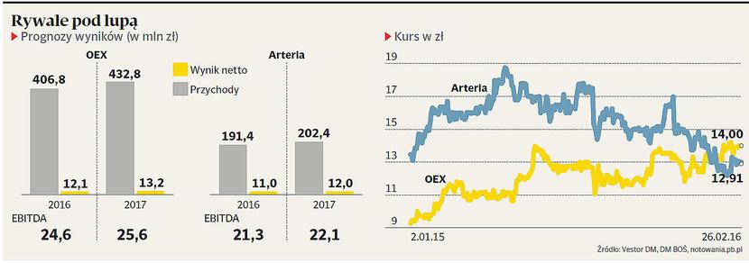 Akcje Arterii są 17 proc. tańsze niż w lutym 2015 r. W zgoła odmiennych nastrojach są akcjonariusze OEX (to nowa nazwa spółki Tell), którzy są ponad 30 proc. „do przodu”. Obie firmy zajmują się outsourcingiem sprzedaży, obie przejmują inne podmioty, by wzmocnić swoją pozycję rynkową, ale to, co robi OEX, ewidentnie bardziej podoba się inwestorom.