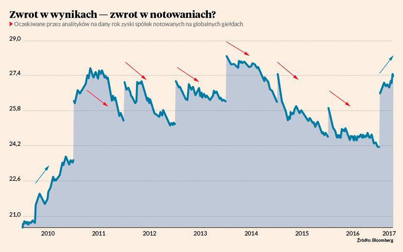 Prognozy są podwyższane nawet pomimo tego, że już na początku roku były dość optymistyczne, zauważają specjaliści banku JPMorgan Chase. Obecnie konsensus prognoz na ten rok zakłada poprawę zysków w Europie w porównaniu z 2016 r. o 15 proc., w USA o 9 proc., a w Japonii o 16 proc. Według JPMorgan Chase wyniki spółek w pierwszym kwartale mogą być jeszcze lepsze od już podwyższonych prognoz. Wskazują na to między innymi zmiany w polityce cenowej przedsiębiorstw, dźwignia operacyjna, wyższe ceny surowców oraz sprzyjające warunki kredytowania.