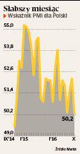 Czwarty kwartał w polskim przemyśle zaczął się w minorowych nastrojach. Wskaźnik PMI, odzwierciedlający m.in. nowe zamówienia, produkcję czy zatrudnienie, w październiku spadł w porównaniu z wrześniem aż o 2 pkt., do zaledwie 50,2 pkt. To najmniej od września 2014 r., choć wskaźnik wciąż wynosi ponad 50 pkt., co oznacza ogólną poprawę sytuacji. „Październikowe wyniki odzwierciedlały przede wszystkim słabe tempo wzrostu wielkości produkcji, które zwolniło w związku ze spadkiem liczby nowych kontraktów. Tymczasem poziom zatrudnienia wzrósł najwolniej od ponad dwóch lat, a firmy ograniczyły aktywność zakupową pierwszy raz od trzech miesięcy”— podaje w komunikacie Markit Economics.