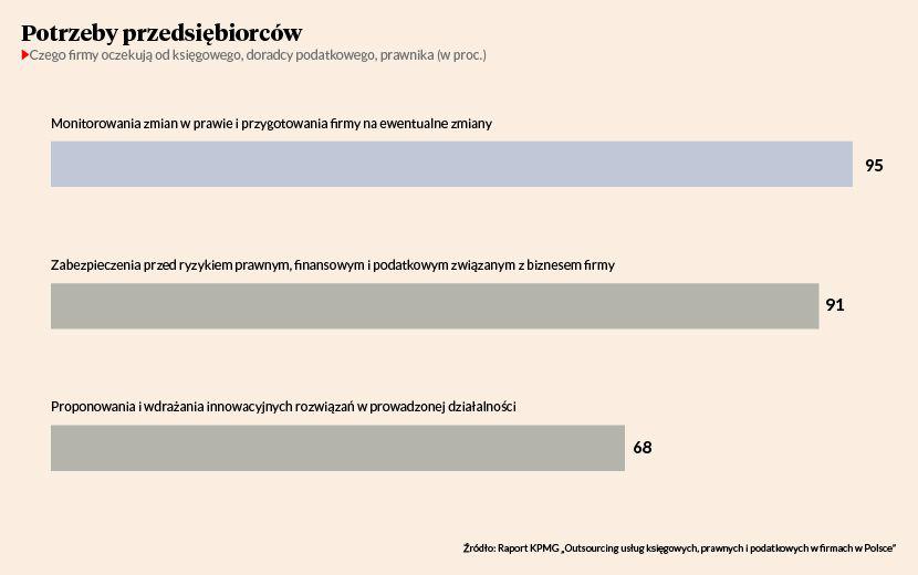 Współpraca z zewnętrzną księgowością oraz doradztem podatkowym i prawnym jest popularna przede wszystkim wśród najmniejszych firm. Korzysta z niej ok. 40 proc. respondentów zatrudniających do dziewięciu osób. Zdecydowana większość, bo 71 proc. firm liczących więcej niż 50 pracowników, zleca tylko usługi prawne. Jak podkreślono w raporcie, możliwość zlecenia niektórych usług na zewnątrz coraz bardziej doceniają małe i średnie przedsiębiorstwa, w których piony księgowości, obsługi prawnej i podatkowej nie są i nie mogą być tak rozbudowane w strukturze organizacyjnej przedsiębiorstwa, aby móc obsługiwać odpowiednią liczbę spraw i rozwiązywać pojawiające się problemy.