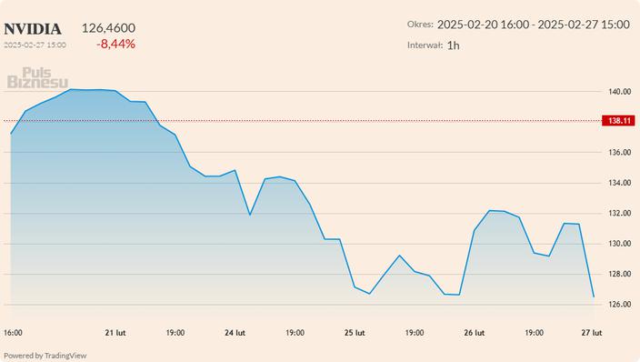 Nvidia zwiększyła kwartalny zysk netto o 79 proc. do 22,09 mld USD, a zysk na akcję okazał się wyższy niż oczekiwano. W środowym handlu posesyjnym cena akcji spółki mocno się wahała, ale ostatecznie spadła o 1,5 proc. Również początek czwartkowej sesji na papierach spółki miał nerwowy charakter. Choć początkowo kurs odbił, notując około 1,5-procentową zwyżkę, szybko powrócił w czerwone regiony, spadając o ponad 4 proc.