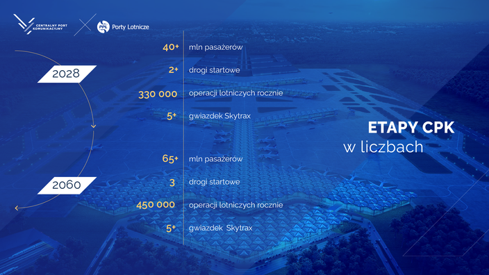 Pierwszy etap lotniska, czyli dwie równoległe drogi startowe i infrastruktura do obsługi 40 mln pasażerów, ma zostać uruchomiony w 2028 r. Plan Generalny CPK zakłada, że następnie port będzie w sposób modułowy rozbudowywany. Jak wynika z prognoz Międzynarodowego Zrzeszenia Przewoźników Lotniczych (IATA), w 2060 r. lotnisko może obsługiwać do 65 mln pasażerów.