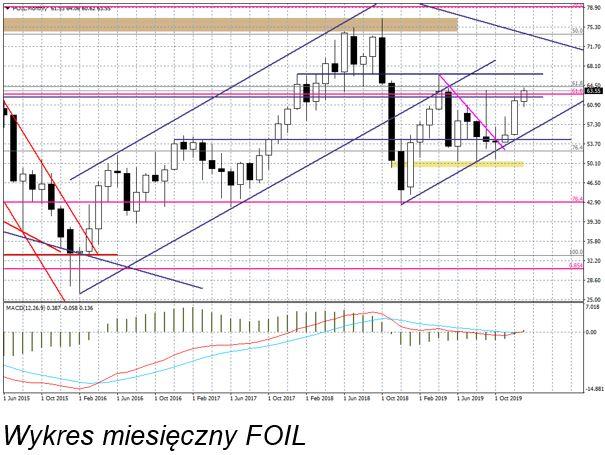 Miesięczny wykres notowań ropy WTI zamieszczony poniżej jest dość wymowny, jeżeli dodamy do wykresu bazowego chociażby trendowy wskaźnik MACD.