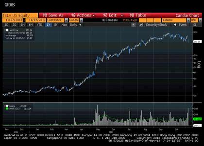 Notowania Tesla Motors w ciągu ostatniego roku. Źródło: Bloomberg.