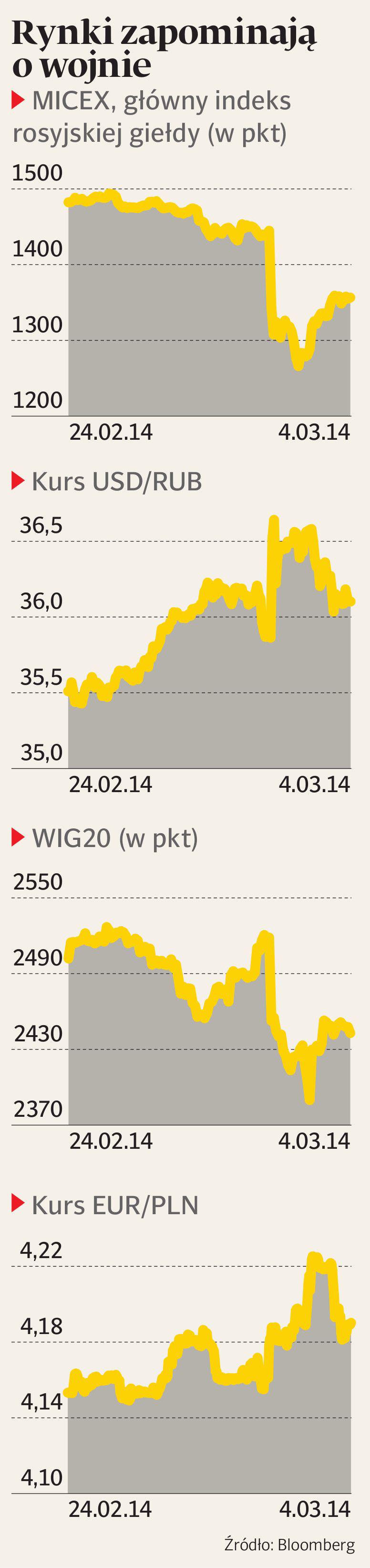 Na rynkach finansowych zapanowała odwilż. Po konferencji prasowej Władimira Putina, prezydenta Rosji, inwestorzy odetchnęli z ulgą i zaczęli wracać do porzuconych w poniedziałek aktywów. MICEX, główny indeks rosyjskiej giełdy, wzrósł we wtorek o 6 proc., czyli odrobił około połowę strat z poprzedniej, dramatycznej sesji. Kurs rubla do dolara wzrósł o 1,3 proc., a rentowność dwuletnich obligacji Rosji spadła z 7,9 do 7,7 proc.