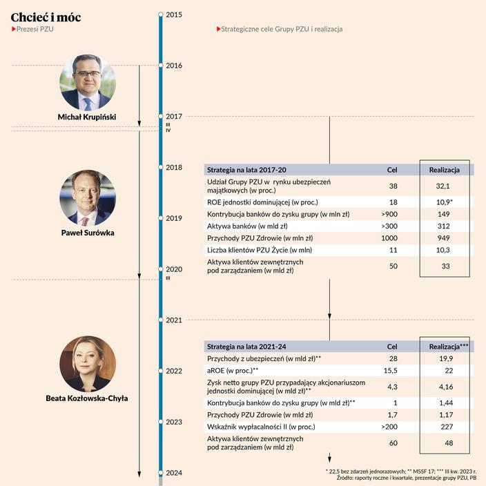 W grudniu 2015 r. Andrzej Klesyk zrezygnował z kierowania PZU. Po wyborach, wygranych przez PiS stanowisko prezesa grupy objął Michał Krupiński. Poprzednik zostawił mu strategię na lata 2015-20, która miała postawić grupę na trzech solidnych filarach: ubezpieczeniach, zarządzaniu aktywami (PZU Inwestycje) i opiece medycznej (PZU Zdrowie). Wyznaczył też cele: powyżej 35 proc. udziałów w ryku majątkowym i 45 proc. w życiowym, przeszło 650 mln zł przychodów PZU Zdrowie, ponad 11,5 proc. udziałów w rynku TFI i 20 proc. ROE grupy.