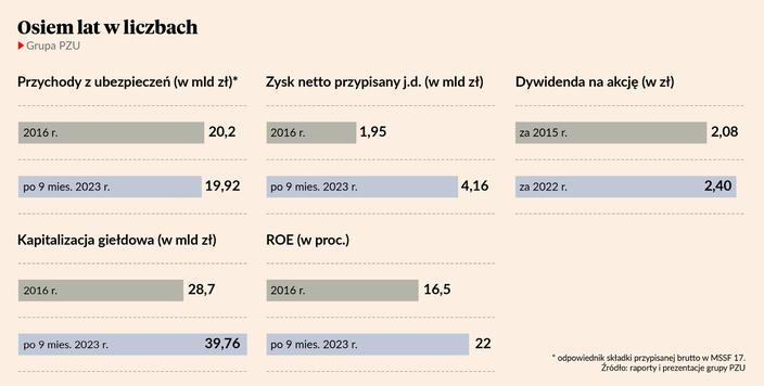 Za prezesury Pawła Surówki zyski PZU wzrosły, jednak kosztem udziałów w rynku, choć ubezpieczyciel cały czas utrzymywał pozycję lidera. 2017 r. grupa zakończyła rekordowym wynikiem netto wysokości 4,2 mld zł (zysk netto przypadający na akcjonariuszy jednostki dominującej wyniósł 2,9 mld zł wobec 1,9 mld zł rok wcześniej) i rekordową sprzedażą na poziomie 22,8 mld zł. Rok później zysk był jeszcze wyższy - 5,4 mld zł (3,2 mld zł zysk jednostki dominującej), a składka przypisana brutto sięgnęła 23,5 mld zł.