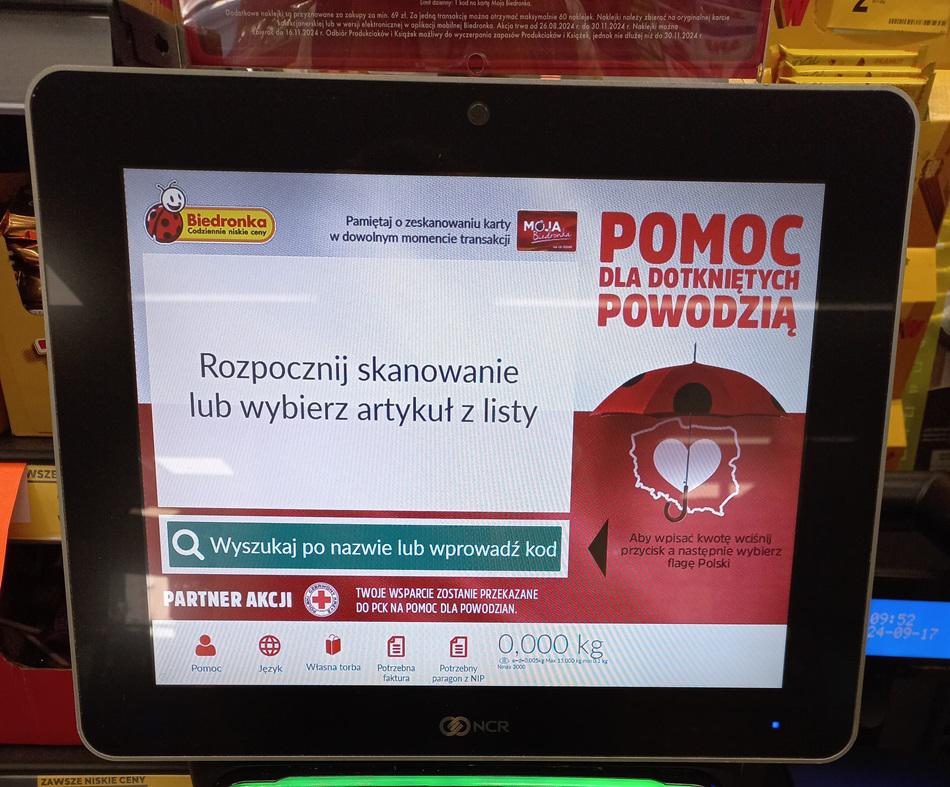 Biedronka, rozumiejąc, że skuteczna pomoc wymaga skoordynowanych działań, nawiązała współpracę z kluczowymi organizacjami charytatywnymi: Polskim Czerwonym Krzyżem, Caritas i Szlachetną Paczką. Wspólnie zorganizowano zbiórki pieniężne na kasach sklepów sieci Biedronka w całej Polsce, a zebrane środki, które przekroczyły już 2 mln zł, zostały przeznaczone m.in. na pomoc materialną w postaci zakupu artykułów gospodarstwa domowego, materiałów budowlanych, osuszaczy i nagrzewnic, sprawną logistykę i organizację pracy wolontariuszy, którzy docierają z pomocą do najbardziej potrzebujących, zapewnienie ciepłych posiłków dla poszkodowanych czy wsparcie rodzin dotkniętych powodzią w ramach programu Szlachetna Paczka.