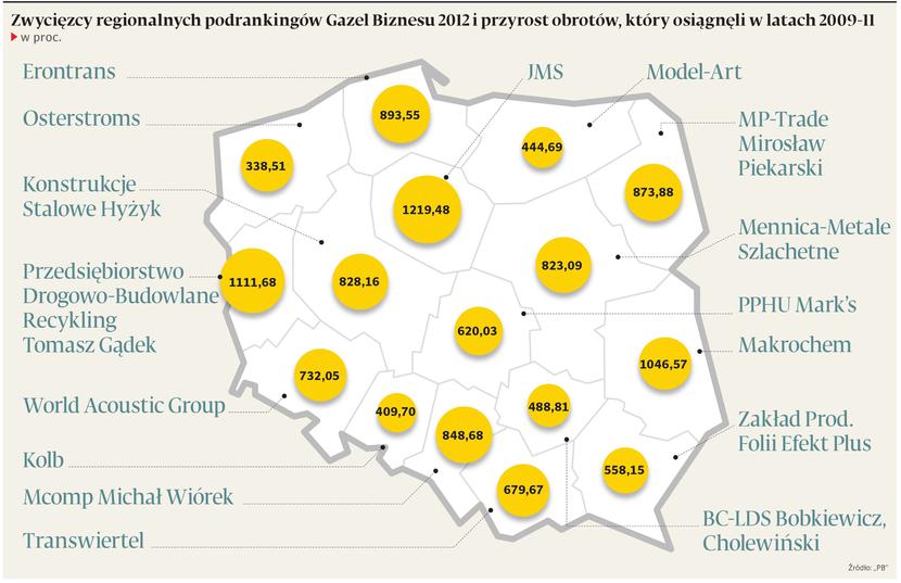 Przypomnijmy: lista „Gazele Biznesu 2012” powstawała na podstawie wyników, jakie firmy osiągnęły w trzyletnim okresie po załamaniu światowej gospodarki w 2008 r., i w klimacie wielkiej rynkowej niepewności. I mimo tych trudnych warunków w naszym zestawieniu znalazła się rekordowa liczba firm — aż 4342. Co prawda przyrosty obrotów osiągnięte przez tegoroczne Gazele Biznesu nie są na ogół tak spektakularne, jak to bywało w latach największej prosperity, ale może to być dowodem, że małe i średnie przedsiębiorstwa w Polsce okrzepły i potrafią nie tylko wykorzystywać sprzyjające warunki do szybkiego rozwoju, ale również radzić sobie w trudniejszych czasach.