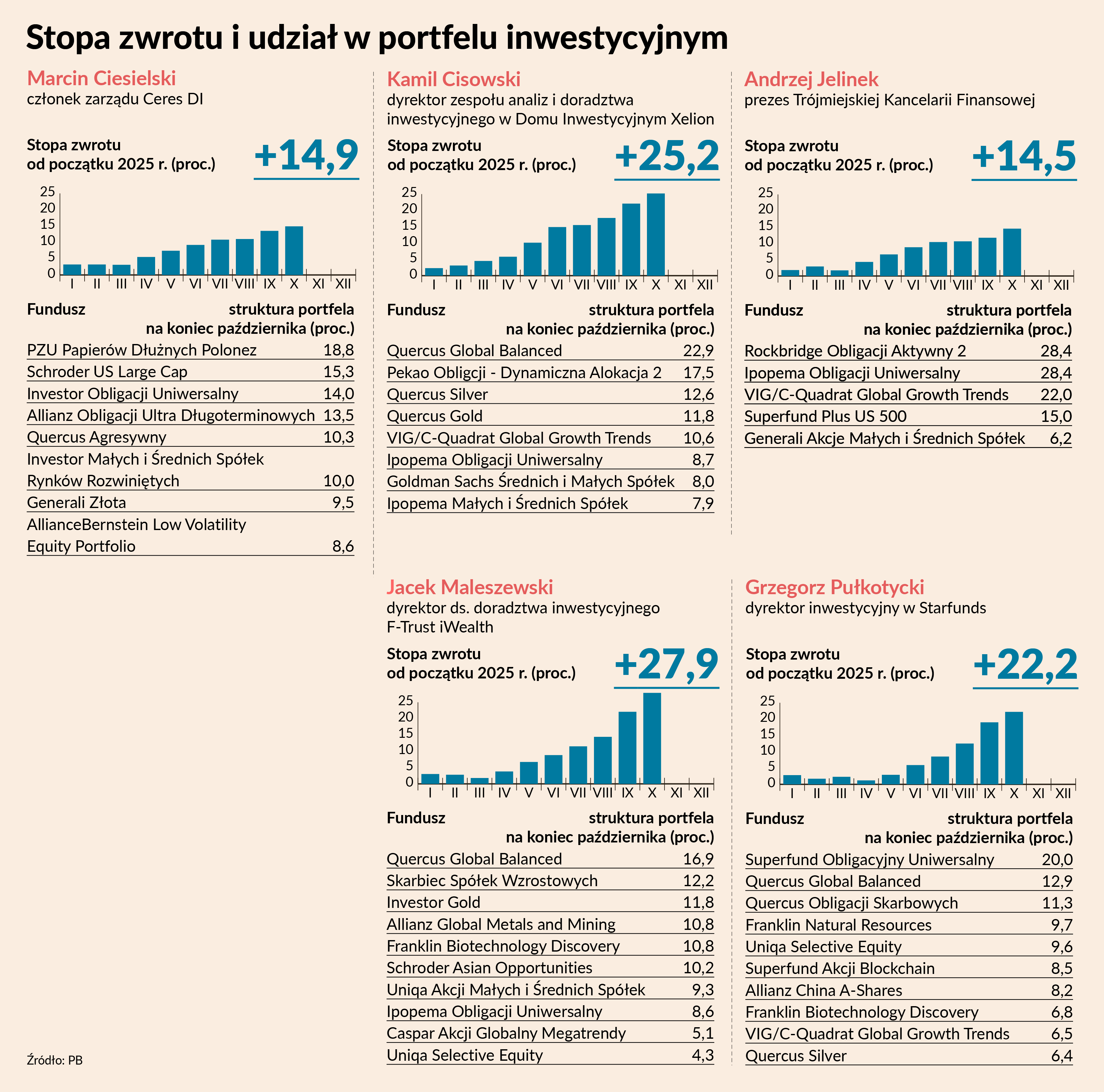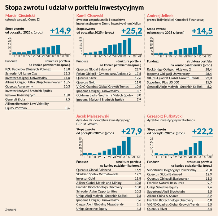 Spośród portfeli funduszy proponowanych przez przedstawicieli firm doradczych na 2025 r. od marca począwszy najwyższą stopą zwrotu wykazywała się kompozycja Kamila Cisowskiego, dyrektora zespołu analiz i doradztwa inwestycyjnego DI Xelion. We wrześniu wyrównał ją portfel Jacka Maleszewskiego, dyrektora ds. doradztwa inwestycyjnego F-Trust iWealth i obaj dzielili pierwsze miejsce w rankingy PB. W październiku portfel Jacka Maleszewskiego wyszedł na bezapelacyjne prowadzenie.