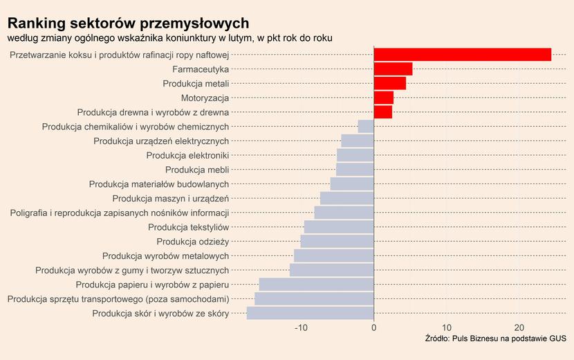 Ranking sektorów powstaje na podstawie ogólnego wskaźnika koniunktury, publikowanego przez GUS i będącego wynikiem comiesięcznych badań ankietowych wśród przedsiębiorstw. Wskaźnik pokazuje odsetek netto firm, które oceniają swoją sytuację jako lepszą (czyli wartość ujemna oznacza, że więcej jest firm, które oceniają swoją sytuacje jako gorszą). A do rankingu używamy rocznej zmiany tego wskaźnika. Pozwala on zorientować się szybko w strukturze zmian gospodarczych w Polsce. Specyfika rankingu sprawia, że nie widać w nim ogólnego poziomu nastrojów, ale zmianę nastrojów – chcemy bowiem pokazać dynamikę poszczególnych sektorów.