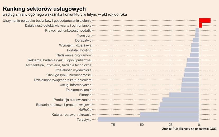 Na dnie rankingu wciąż są sektory najmocniej dotknięte przez pandemię, czyli turystyka, kultura, rozrywka, gastronomia i hotelarstwo. W tych obszarach nastroje są bardzo złe, mimo poprawy względem stycznia.