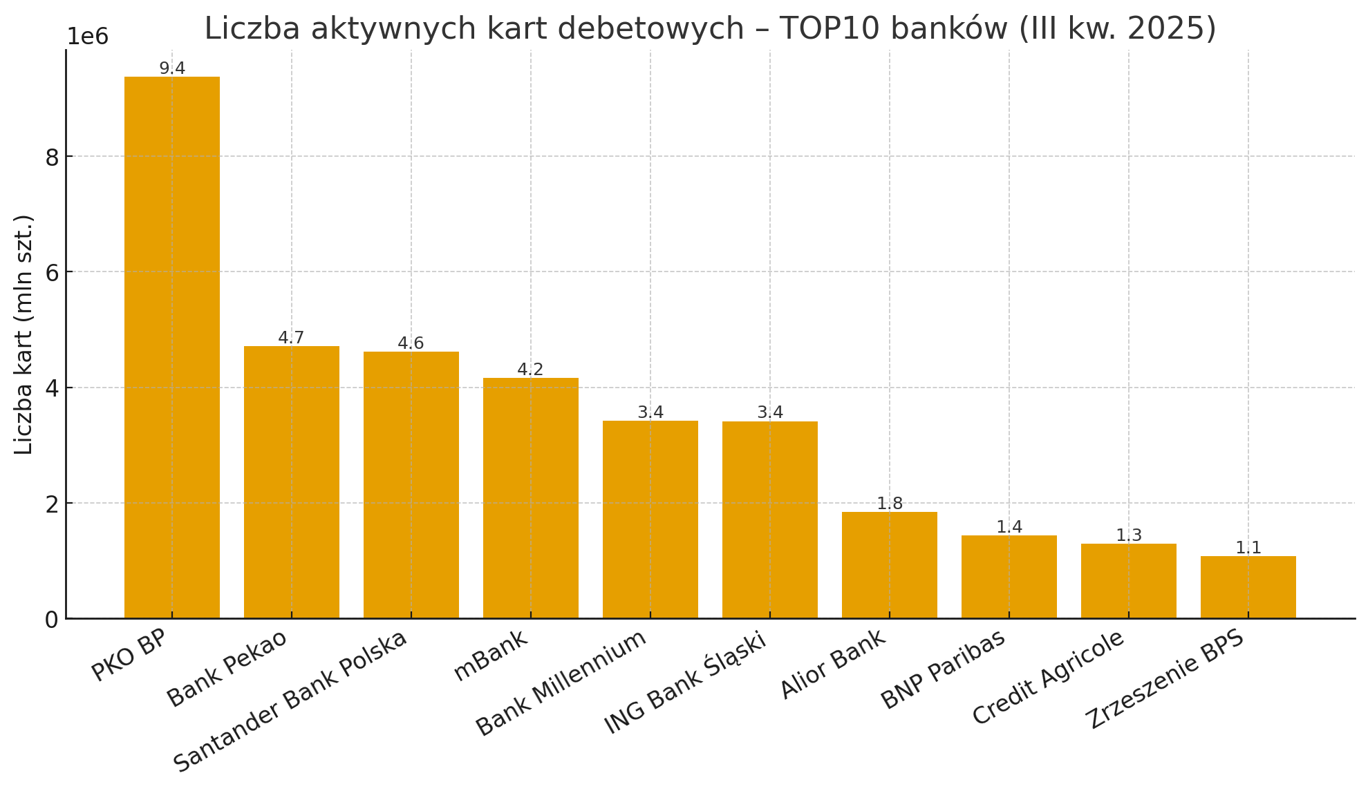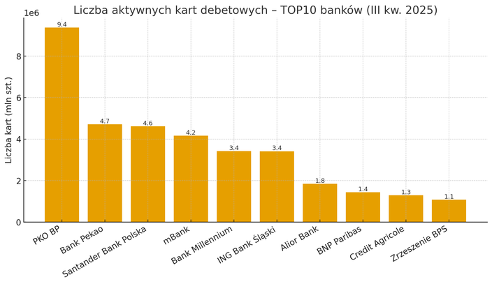 Liderzy rynku pozostają ci sami. PKO BP z wynikiem ponad 9,3 miliona kart utrzymuje udział rzędu jednej czwartej całego rynku. Na kolejnych miejscach są Bank Pekao, Santander, mBank i Bank Millennium. Pierwsza piątka odpowiada już za większość wszystkich kart w kraju. Udziały są stabilne, ale w tle widać ciekawe przesunięcia – niektóre banki odbudowują portfele po wcześniejszych spadkach, inne powoli tracą tempo.
