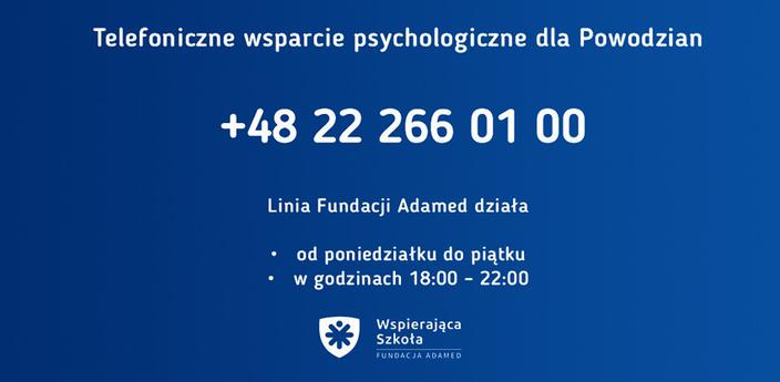 Pierwszym elementem pomocy Fundacji Adamed było uruchomienie dedykowanej linii wsparcia psychologicznego dla powodzian. Pomoc udzielana jest pod numerem +48 22 266 01 00 od poniedziałku do piątku w godz. 18–22. Każdy, kto zadzwoni pod wskazany numer, otrzyma wsparcie psychologiczne oraz możliwość rozmowy z wykwalifikowanymi psychologami serwisu Życie Warte Jest Rozmowy, którzy pomogą w walce ze stresem, lękiem i traumą spowodowaną powodzią.