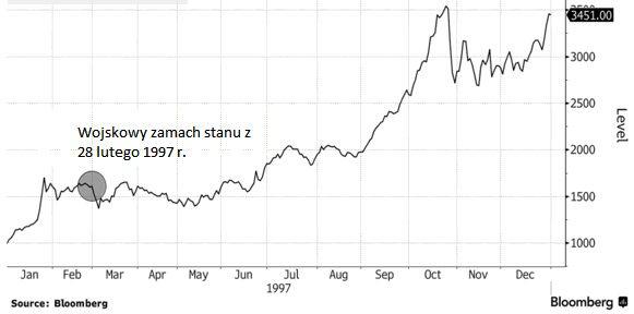 Notowania indeksu XU100 w 1999 r., z zaznaczonym momentem zamachu stanu z lutego 1997 r. Źródło: Bloomberg.