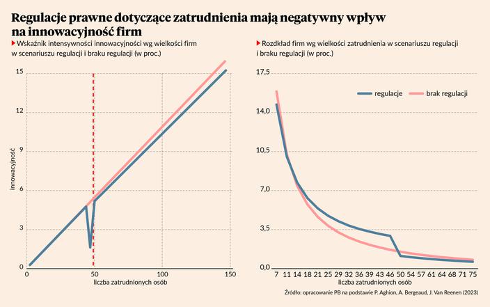 Nie jest to tylko czcze gadanie polityków. Jako kontekst tych wypowiedzi warto przytoczyć dwa badania naukowe. Wyniki jednego z nich opisali ekonomiści P. Aggion, A. Bergeaud i J. Van Reenen w artykule „The Impact of Regulation on Innovation”. Sprawdzili, czy wzrost obciążenia regulacyjnego dusi innowacyjność francuskich firm. Konkluzja jest taka, że owszem. Konkretnie: we Francji powoduje spadek całkowitej innowacyjności w sektorze przedsiębiorstw o 5,2 proc., co przekłada się na zmniejszenie dobrobytu mierzonego poziomem konsumpcji, o 2,2 proc.