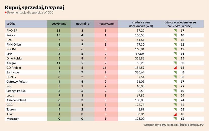 PZU, PGNiG i Asseco Poland to spółki z WIG20, dla których nie obowiązuje obecnie ani jedna negatywna rekomendacja, wynika z danych agencji Bloomberg. Średnia z cen docelowych dla każdej z tych spółek jest o co najmniej kilkanaście procent wyższa od kursu na GPW. Największa różnica między wycenami teoretycznymi a wycenę rynkową dotyczy natomiast CCC, co jest w dużej mierze konsekwencją około 40-procentowej przeceny akcji obuwniczej spółki od początku tego roku. Inwestorzy obawiają się wzrostu kosztów i wysokiego zadłużenia (zwłaszcza w otoczeniu rosnących stóp procentowych), a analitycy zapewne już wnikliwie analizują najnowszy raport spółki i wkrótce można spodziewać się aktualizacji raportów. Nie należy jednak przesądzać, że będą one zawierały niższe ceny docelowe.
