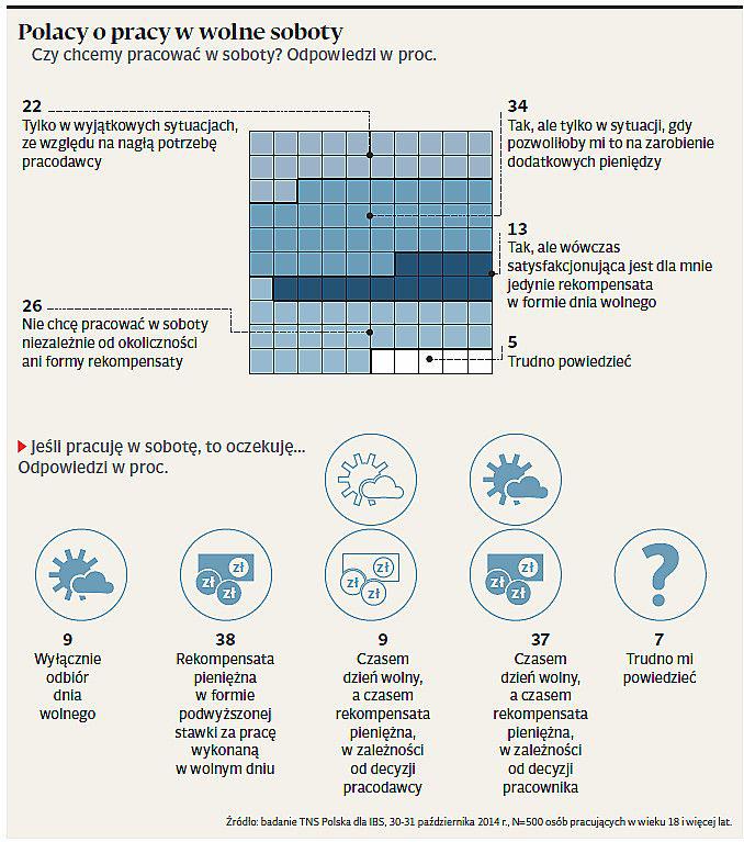 Osoby pracujące w wolne soboty najczęściej w zamian otrzymywały dodatkowe wynagrodzenie (27 proc.), nieco rzadziej inny dzień wolny (19 proc.). Zdaniem Konfederacji Lewiatan, badanie pokazuje,że 47 proc. badanych chce pracować w sobotę za dodatkowe pieniądze lub dzień wolny.