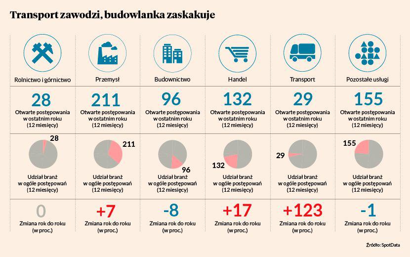 Problemy nasiliły się w przemyśle metalowym, handlu hurtowym i transporcie.Wszystko wskazuje na to, że ten rok zakończy się osiągnięciem 1050-1100 przypadkami niewypłacalności wobec 920 w ubiegłym. Na pierwszy plan wysuwa się skokowy wzrost problemów z obsługą zadłużenia w transporcie i logistyce. Przypadków niewypłacalności przybyło zwłaszcza w ciągu ostatnich trzech miesięcy. Tylko w październiku niewypłacalność ogłosiło 17 firm transportowych wobec 42 w całym 2017 r. W tym roku aż 62 firmy (w tym 29 osób prawnych) ogłosiło niewypłacalność, podczas gdy w analogicznym okresie 2017 r. takich przypadków było 30 (w tym 13 osób prawnych). Przyczyn można upatrywać w rosnących kosztach pracy i perspektywie dalszego ich zwiększenia (ze względu na dyrektywę unijną o pracownikach delegowanych) oraz drożejącym paliwie. Głównym problemem może też być spowolnienie w UE. Koniunktura w polskim transporcie jest silnie uzależniona od koniunktury gospodarek zachodnich, z którą wiąże się zapotrzebowanie na przewóz towarów. Skoro od początku roku sytuacja gospodarcza w strefie euro się pogarsza, to musiało to również wpłynąć na polskich transportowców mających aż 30-procentowy udział w unijnym rynku przewozów międzynarodowych.