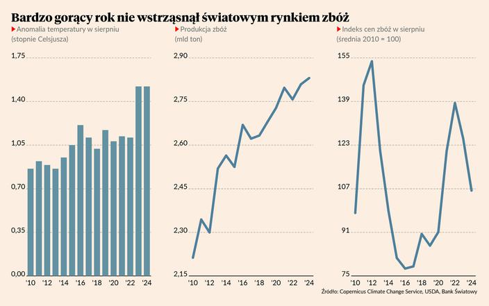Czy wzrost produkcji i spadek cen w warunkach tak wysokiej temperatury jest jakąś pozytywną anomalią? W pewnej mierze tak. W przeszłości bardzo wysoki skok temperatury zwykle wiązał się z pogorszeniem zbiorów w skali świata, ale nie była to reguła. Współczynnik korelacji między realną dynamiką produkcji rolnej a odchyleniem temperatury od długookresowej średniej (obie miary dla świata) wynosi -0,2, czyli niewiele. Przy większych anomaliach rośnie do 0,4-0,5, czyli więcej. W krótkim okresie nie ma jednak dużej zależności.