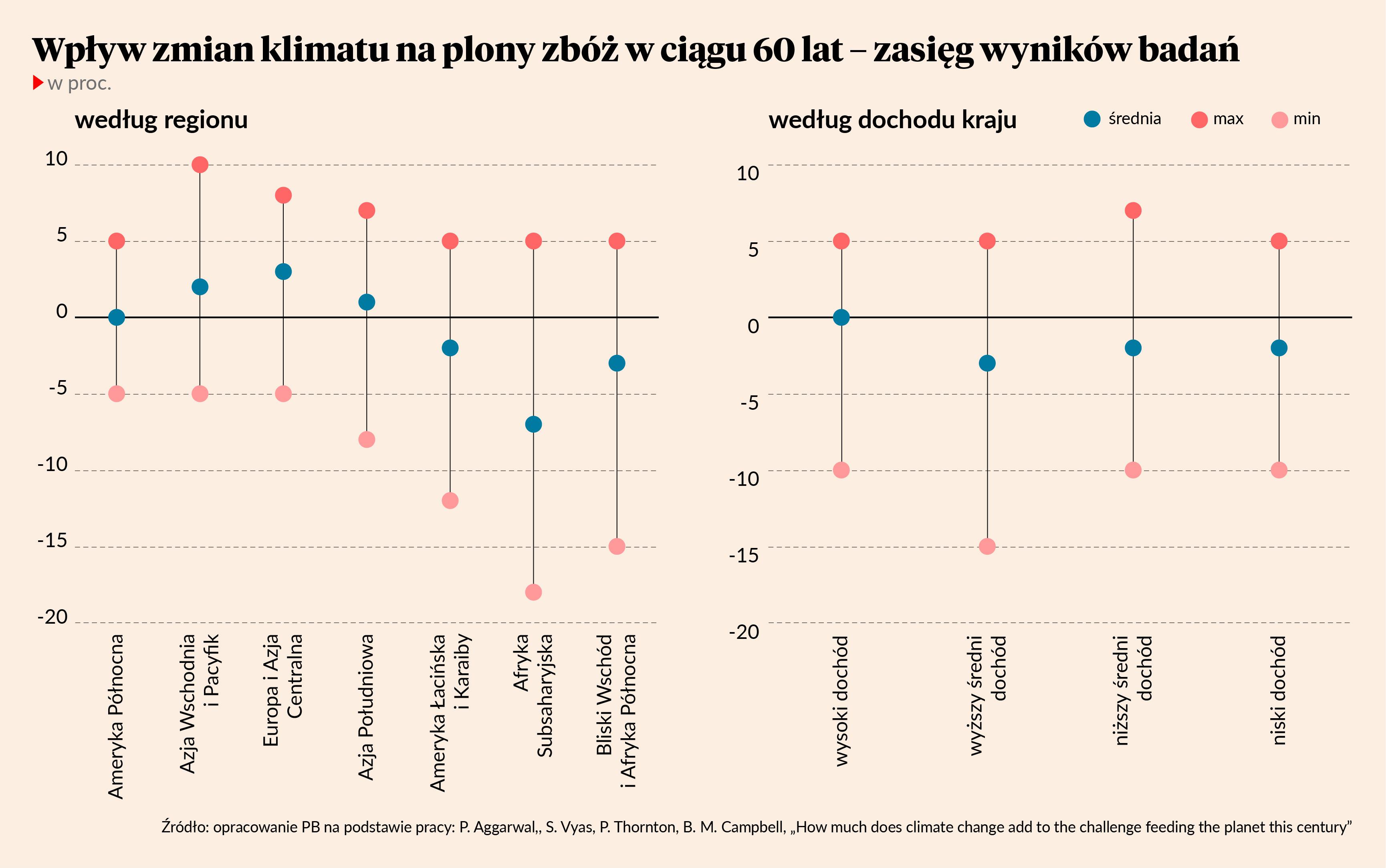 Konsekwencje zmian klimatycznych oczywiście zależą od położenia geograficznego i poziomu rozwoju. Z badań wynika ewidentnie, że największy spadek w wydajności rolnictwa grozi gospodarkom położonym w Afryce Subsaharyjskiej i Północnej oraz na Bliskim Wschodzie, czyli na globalnym Południu. Najbardziej więc mogą ucierpieć najbiedniejsze kraje, gdzie — po pierwsze — rolnictwo ma wyższy udział w zatrudnieniu i generowaniu wartości dodanej, a po drugie — gdzie mieszka większość światowej populacji dotkniętej brakiem bezpieczeństwa żywnościowego. Ze względu na bardziej umiarkowany klimat i wyższy poziom postępu technologicznego kraje o wysokim dochodzie zostaną prawdopodobnie najmniej dotknięte albo nawet w ogóle. Średnia szacowana zmiana plonów w krajach o wysokich dochodach to 0 proc. Warto jednak podkreślić, że te szacunki cechują się bardzo wysokim ryzykiem błędu.