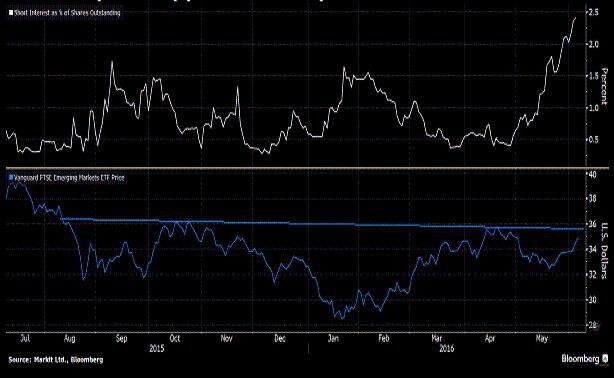 Od styczniowego dna notowania indeksu wschodzących rynków akcji MSCI Emerging Markets odbiły o 19,6 proc. Po majowej korekcie wskaźnik znów rośnie, jednak w trwałość hossy nie wierzy spora część inwestorów. Udział krótkich pozycji w jednostkach Vanguard FTSE Emerging Markets ETF, największego z funduszy indeksowych akcji emerging markets, sięgnął 2,4 proc. wartości jego aktywów, najwyższego poziomu od blisko dwóch lat.