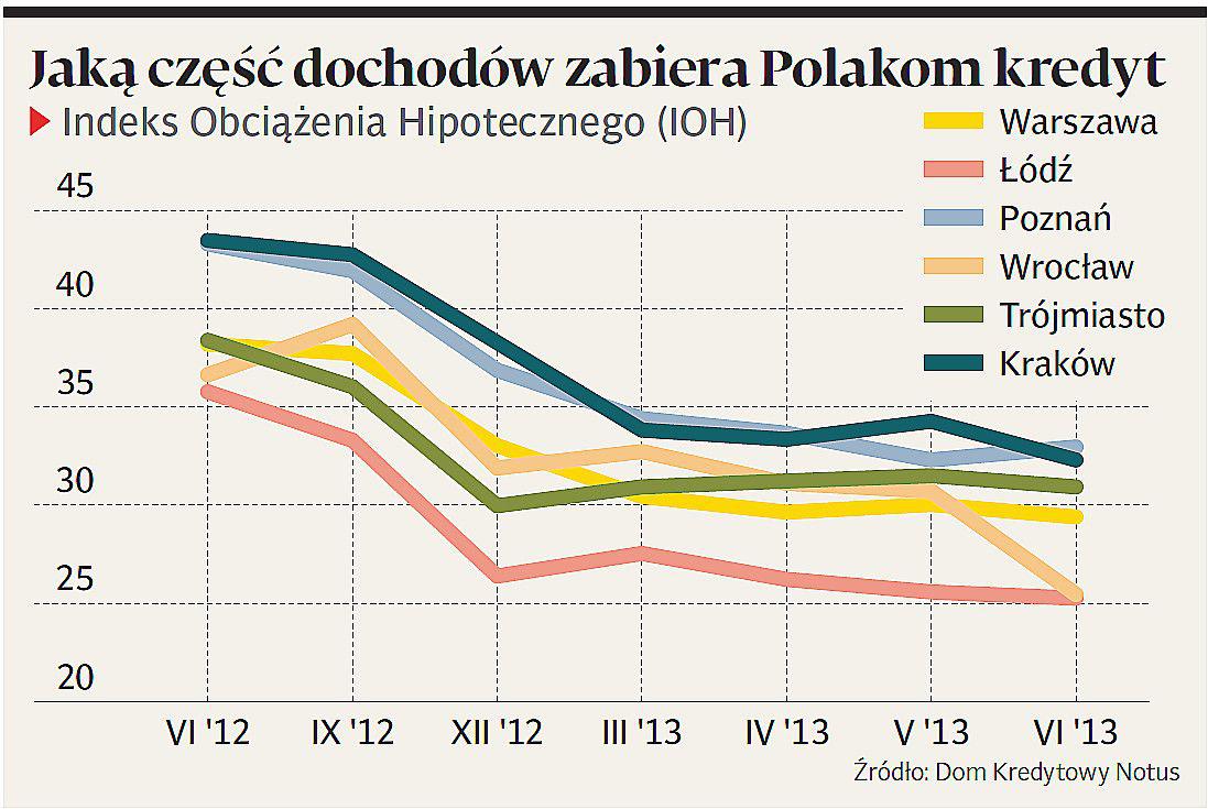 Indeks Obciążenia Hipotecznego (IOH) pokazuje, jak dużą część dochodu netto pochłania comiesięczna rata kredytu hipotecznego. Według danych zebranych przez Dom Kredytowy Notus, przeciętna polska rodzina w drugim kwartale 2013 r. przeznaczała na spłatę kredytu mniej niż 3 miesiące wcześniej.
