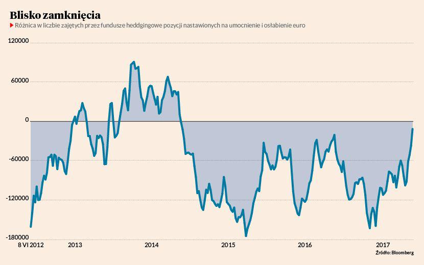 Fundusze hedgingowe poprawiały nastawienie do euro przez pięć tygodni z rzędu, czemu towarzyszyły zaskakująco słabe dane z gospodarki amerykańskiej oraz dobre odczyty z Europy. Obliczany przez Citigroup indeks niespodzianek ekonomicznych dla USA zanurkował poniżej zera, co oznacza, że dane są przeciętnie słabsze od oczekiwań. Tymczasem analogiczny wskaźnik dla strefy euro od przełomu roku nieprzerwanie utrzymuje się w okolicach szczytów z 2013 i 2015 r.