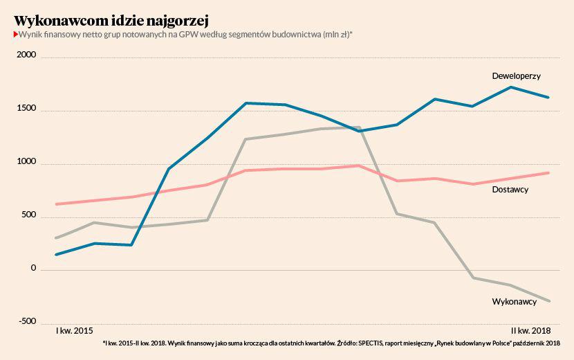 Z przygotowanego przez firmę badawczą Spectis raportu „Rynek budowlany w Polsce — październik 2018” wynika, że w II kw. 22 grupy budowlane notowane na warszawskiej giełdzie poniosły zagregowaną strata netto w wysokości 101 mln zł. Rok wcześniej miały 52 mln zł zysku netto. Zagregowana strata netto wszystkich podmiotów w okresie od lipca 2017 r. do czerwca 2018 r. sięgnęła 289 mln zł. To najgorszy wynik od III kw. 2013 r. Wynik finansowy branży spada już od pięciu kwartałów, a trzeci raz z rzędu jest ujemny.