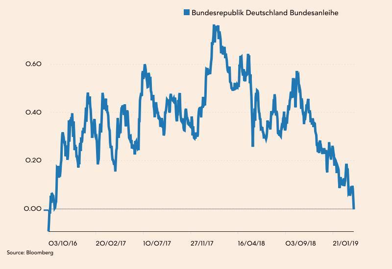 Inwestorzy kupują niemiecki dług w obliczu narastających dowodów świadczących o spowolnieniu gospodarczym w strefie euro oraz gołębich prognoz globalnych banków centralnych.