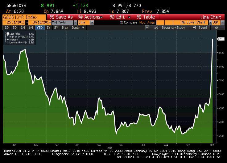 Rentowność obligacji Grecji wzrosła w czwartek rano o 85,2 pkt bazowego do 8,72 proc. Zaledwie tydzień wcześniej wynosiła 6,6 proc., przypomina FT.