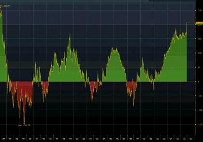 Różnica w rentownościach 10-letnich obligacji USA i Niemiec. Kolor zielony oznacza, że wyższe są rentowności papierów amerykańskich, czerwony – że niemieckich. Źródło: Bloomberg.