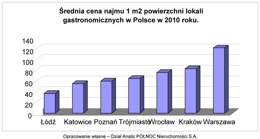 Najniższe średnie ceny najmu lokali gastronomicznych znajdziemy w Łodzi. Lokal na ul. Piotrkowskiej można wynająć już za około 70 zł/m2. Niskie ceny obowiązują także w Katowicach gdzie najtańsze lokale można wynająć płacąc około 30 zł/m2.