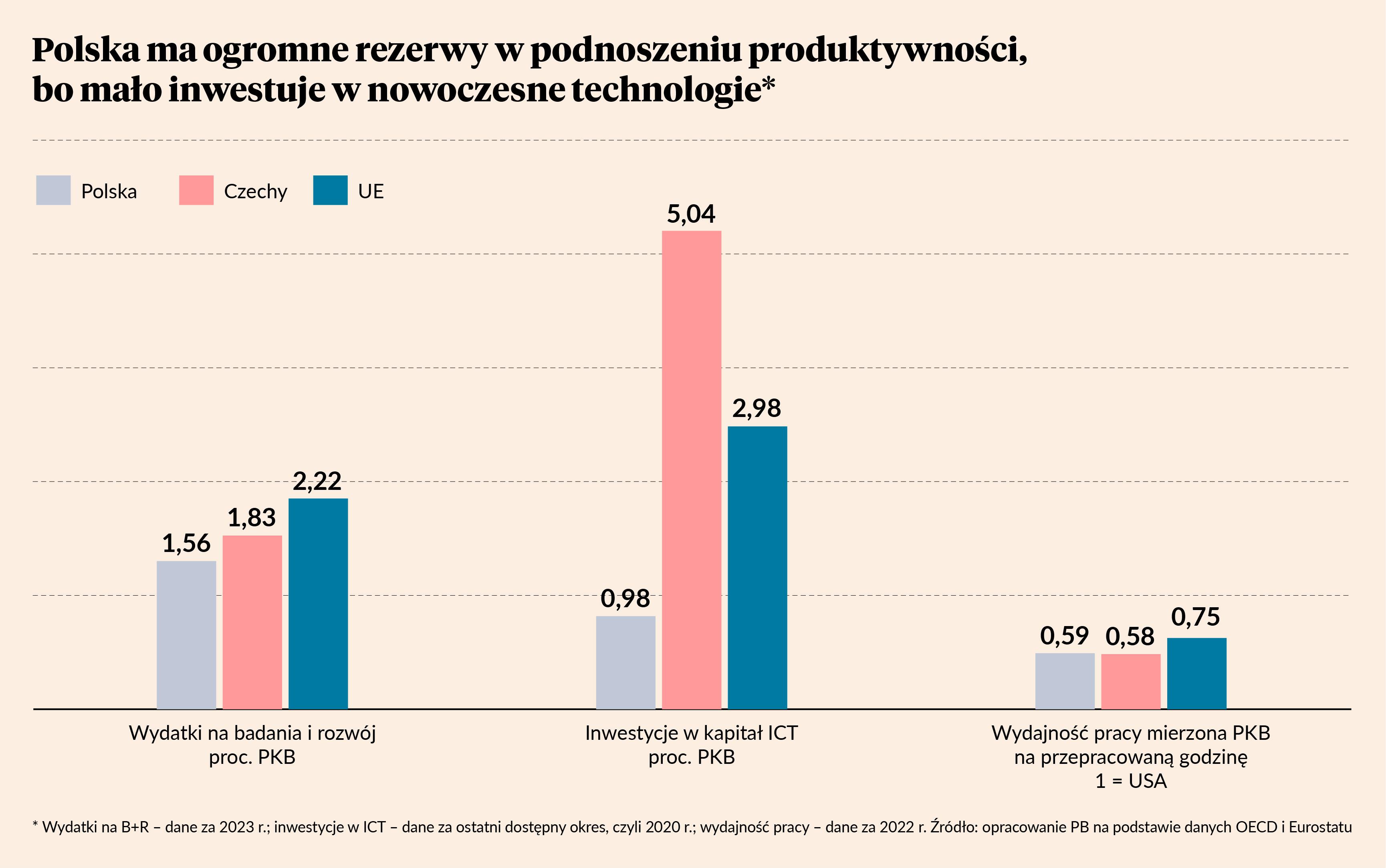 Ta nietypowa ścieżka może paradoksalnie stanowić atut. Wskazuje bowiem, że Polska wciąż ma duże rezerwy w podnoszeniu produktywności kanałem rozwoju naukowego i technologicznego. Wydajność pracy na godzinę jest już całkiem wysoka dzięki wysokiej jakości kapitału ludzkiego (czyli kraj znajduje się dość blisko granicy technologicznej), mimo że jeszcze nie korzystamy z podstawowych ogniw wydajności. Wydatki na badania i rozwój oraz inwestycje w zasoby ICT pozostają bardzo niskie — wynoszą odpowiednio 1,56 i 0,98 proc. PKB według ostatnich dostępnych danych. Dla porównania: w Czechach jest to 1,83 i aż 5,04 proc. PKB. Oznacza to, że Polska ma potencjał do znaczącego zwiększenia produktywności — kluczowego czynnika długookresowego rozwoju gospodarczego — dzięki intensyfikacji inwestycji w naukę i nowe technologie.