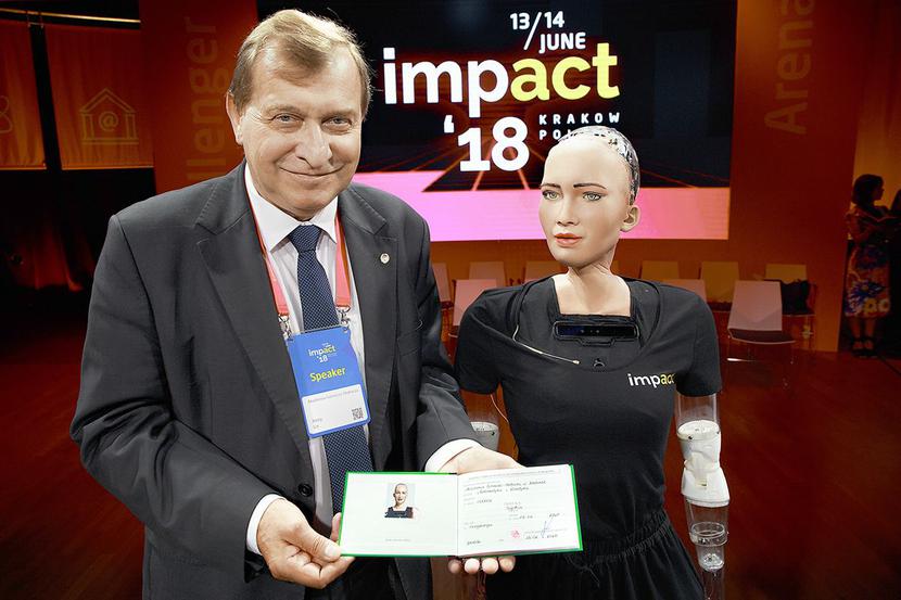 Polskę po raz pierwszy odwiedziła Sophia, humanoidalny robot, który gościł na kongresie Impact’18 w Krakowie (13-14 czerwca 2018 r.). Kariera Sophii zaczęła się trzy lata temu w Hongkongu, gdzie została stworzona przez firmę Hanson Robotics. Jej twórca i wizjoner dr David Hanson wierzy, że sztuczna inteligencja jest przyszłością światowej gospodarki, a Sophia i podobne jej kreacje będą w niedalekiej przyszłości wykorzystywane m.in. w edukacji,służbie zdrowia oraz w punktach obsługi klientów. Robot widzi, potrafi prowadzić normalne rozmowy, symulować tysiące wyrazów twarzy i rozumie znaczenie słów. Umie naśladować ludzkie ruchy i gestykulację. Ma też wbudowany system rozpoznawania twarzy i mimiki, dzięki któremu może określić, w jakim humorze jest jego rozmówca. W 2017 r. Sophia jako pierwszy robot na świecie otrzymała obywatelstwo. Przyznała je Arabia Saudyjska. Teraz Sophia może się poszczycić także indeksem, przyznanym jej podczas Impactu przez Akademię Górniczo-Hutnicza w Krakowie (AGH).