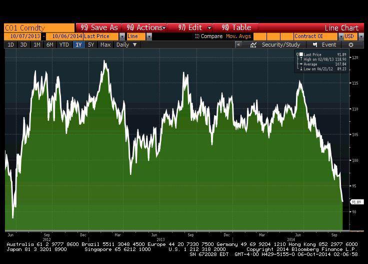 Ropa Brent z listopadowych kontraktów taniała wczesnym rankiem w poniedziałek nawet o 53 centy do 91,78 USD za baryłkę na ICE Futures Europe w Londynie. Od początku roku kurs ropy Brent spadł już o 17 proc.