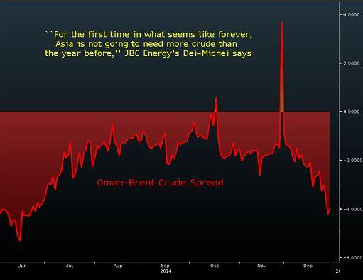 Dyskonto w cenach ropy bliskowschodniej wobec cen ropy brent. Źródło: Bloomberg.
