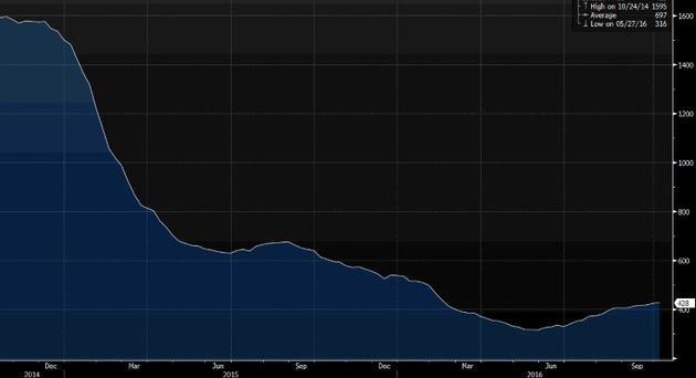 Zmiany liczby czynnych odwiertów naftowych w USA w ostatnich dwóch latach. Źródło: Baker Hughes, Bloomberg.