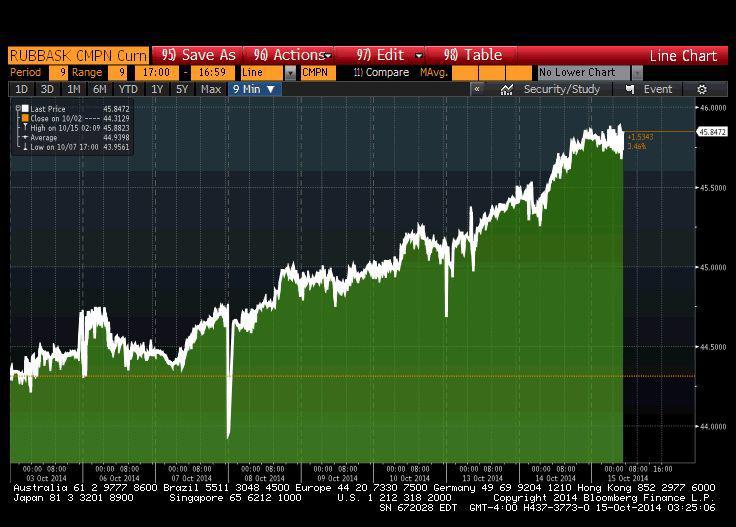 Największa od 14 miesięcy przecena rubla trwa. Bank centralny Rosji ujawnił, że 14 października wydał na jego obronę waluty o równowartości 2,72 mld USD. Ósmy dzień z rzędu zmienił także w środę granicę wahań kursu rubla wobec koszyka dolarów i euro, tym razem do 45,70. W czwartek rano kurs rubla wynosił 45,8877 wobec koszyka dolarów i euro.