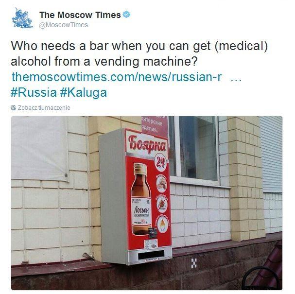 Kanał Kaługa 24 informował kilka dni temu, że w jednym z miast regionu uruchomiono całodobowy dystrybutor sprzedający specyfik na dolegliwości górnych dróg oddechowych, zawierający 70 proc. alkoholu etylowego. Można w nim kupować buteleczki o pojemności 100 ml w cenie 20 rubli (1,23 zł).