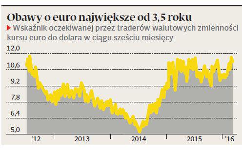Na tydzień przed posiedzeniem EBC wskaźnik oczekiwanych przez traderów walutowych wahań kursu euro do dolara znalazł się najwyżej od trzech i pół roku. Inwestorzy spodziewają się, że instytucja, której szefuje Mario Draghi, może ściąć stopę depozytową mocniej poniżej zera oraz powiększyć program skupu aktywów. To niejedyne zagrożenia dla stabilności euro. W czerwcu w Wielkiej Brytanii odbywa się referendum w sprawie wyjścia z Unii Europejskiej, a wspólnotę zalewa fala emigrantów ze świata arabskiego, zagrażająca trwałości strefy Schengen. Do tego dochodzą obawy o trwałość wzrostu gospodarczego oraz zawirowania polityczne w Irlandii i Hiszpanii, które mogą utrudnić prowadzenie reform fiskalnych w tych krajach.