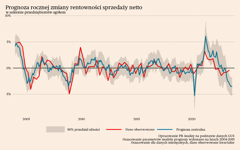 Aktualne dane z polskiej gospodarki wskazują, że rentowność przedsiębiorstw powinna wyraźnie spadać. Relacje historyczne sugerują, że rentowność sprzedaży powinna być teraz niższa o -3,5 pkt. proc. (+/- 1,7 p.p.) w porównaniu z rokiem poprzednim. Natomiast niepewność tego oszacowania jest bardzo wysoka. W drugim kwartale rentowność przedsiębiorstw była znacznie mocniejsza od naszych szacunków, rentowność spadła jedynie o 0,03 p.p. r/r. Wysoka niepewność oszacowania wynika z dużej zmienności danych oraz zróżnicowania sytuacji ekonomicznej w różnych obszarach gospodarki. Dodatkowo szereg kryzysów, jakie przeszedł przez gospodarkę w ostatnim czasie, skłonił przedsiębiorstwa do adaptacji, dzięki czemu są w stanie lepiej chronić swoje marże.