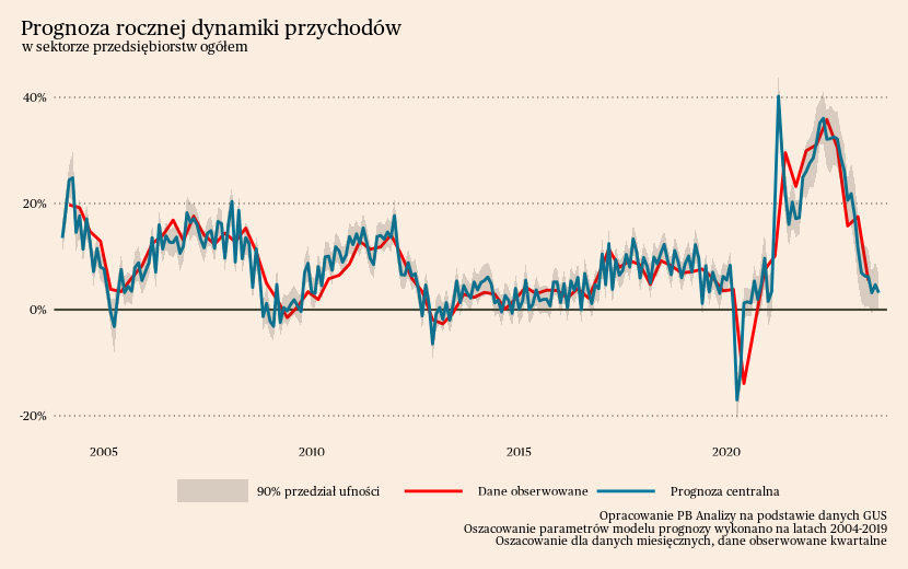 Na podstawie historycznych zależności szacujemy, iż roczna dynamika przychodów znajduje się w trendzie bocznym, ze wskazaniem na delikatne spowolnienie. Roczna dynamika przychodów powinna się obecnie kształtować na poziomie około 3,7 proc. (+/- 3,4 pkt. proc.). Jest to szacunek niemal identyczny z odczytem sprzed dwóch miesięcy, gdy prognoza rocznej dynamiki przychodów wyniosła 3,1 proc.