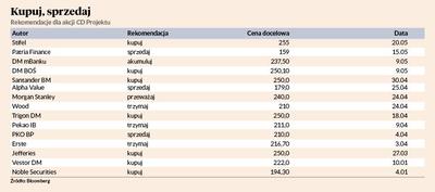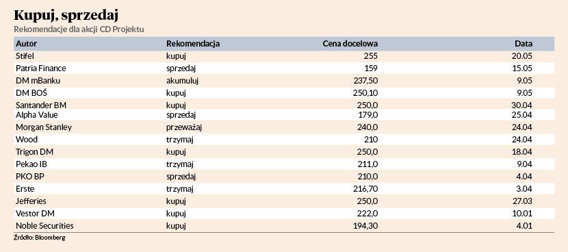 Najświeższa rekomendacja „kupuj” jest autorstwa analityka biura Stifel, który cenę docelową akcji producenta gier wyznaczył na 255 zł. Tak wysoko nie cenił ich jeszcze nikt. Obecnie 9 analityków radzi kupować lub akumulować akcje CD Projektu, 3 rekomendacje są neutralne, a 3 — negatywne. Jedną z nich jest ta wydana 15 maja przez Martina Cakla z czeskiego biura Patria Finance. Jego zdaniem akcje spółki są warte zaledwie 159 zł — to najniższa z cen docelowych, z których średnia to 235,69 zł. Data premiery gry „Cyberpunk 2077” nie została jeszcze ogłoszona, ale rynek spodziewa się, że nastąpi to w czerwcu na targach E3 w Los Angeles.