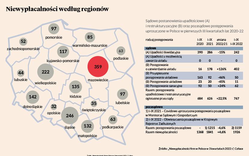 Na łączną liczbę niewypłacalności złożyły się postępowania sądowe i obwieszczenia pozasądowe. Od stycznia do końca września sądy ogłosiły postanowienia o upadłości i restrukturyzacji 767 polskich przedsiębiorstw (czyli o 22,5 proc. więcej niż rok temu).
